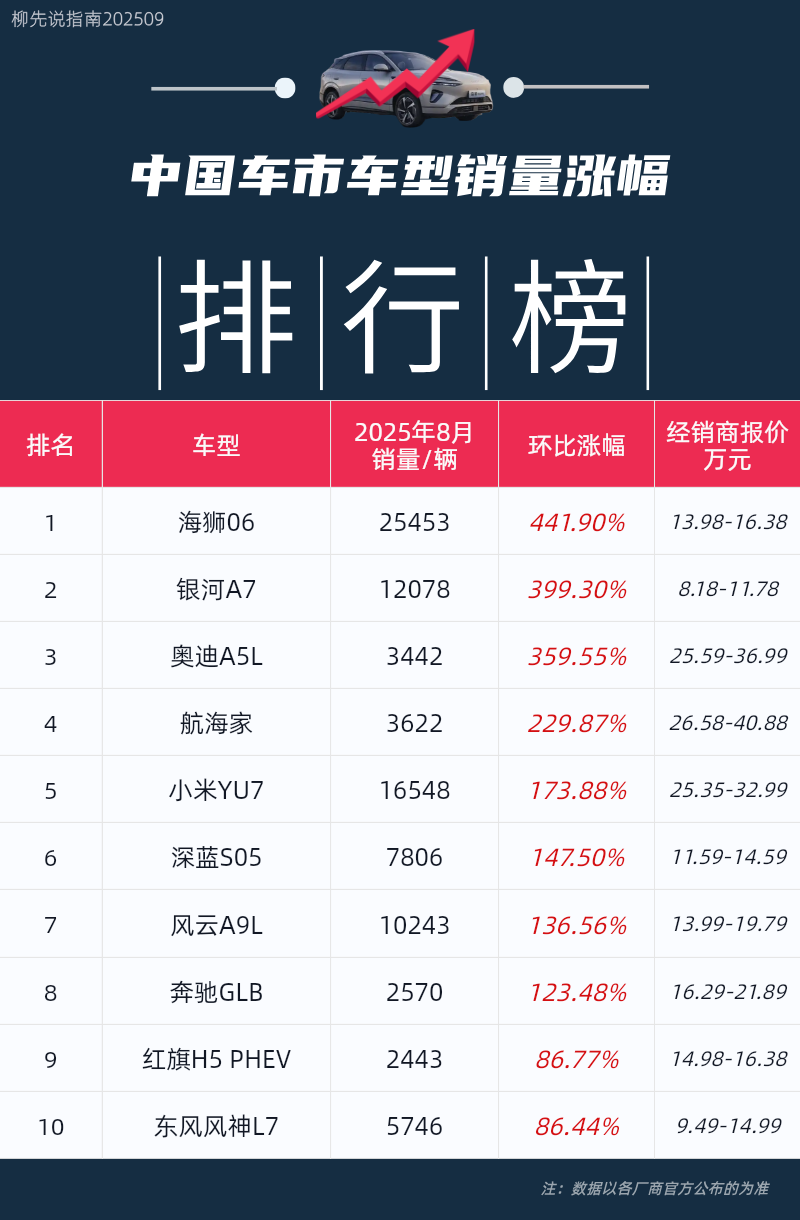 车型销量涨幅排行榜1-5名:海狮06、银河A7、奥迪A5L、航海家以及小米YU7。前三甲销量环比涨幅分别为441.90%、399.30%和359.55%。比亚迪海狮06这款中型SUV同时提供纯电和插混版本,精准覆盖了新能源市场的两大主流需求。其成功背后是精准的产品定位:足够大的空间满足国内家庭对SUV的实用需求,而前卫的设计和智能化配置则吸引了年轻消费者。